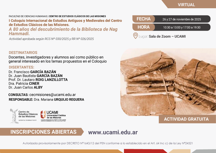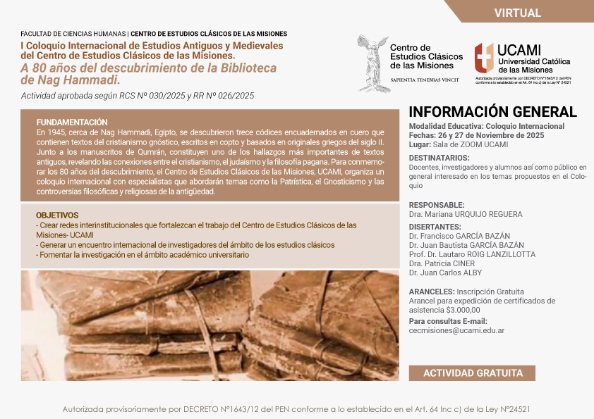 El I Coloquio Internacional de Estudios Antiguos y Medievales del Centro de Estudios Clásicos de las Misiones. A 80 años del descubrimiento de la Biblioteca de Nag Hammadi, se realizará, bajo modalidad virtual, el miércoles 26 y jueves 27 de noviembre de 2025.