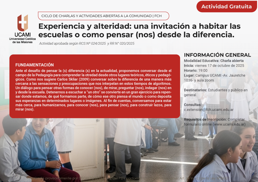 La Facultad de Ciencias Humanas de la UCAMI, a través de su Centro de Extensión, invita a participar de la charla “Experiencia y alteridad: una invitación a habitar las escuelas o cómo pensar(nos) desde la diferencia”, a cargo de la Prof. Juana Elizabet Sánchez.