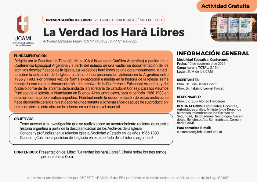 "La Verdad los hará Libres" es una obra monumental e inédita sobre la actuación de la Iglesia Católica en los procesos de violencia en Argentina entre 1966 y 1983.