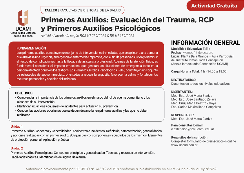 La Facultad de Ciencias de la Salud de la UCAMI invita a participar del Taller “Primeros Auxilios: Evaluación del Trauma, RCP y Primeros Auxilios Psicológicos”, destinado a docentes de todos los niveles educativos.