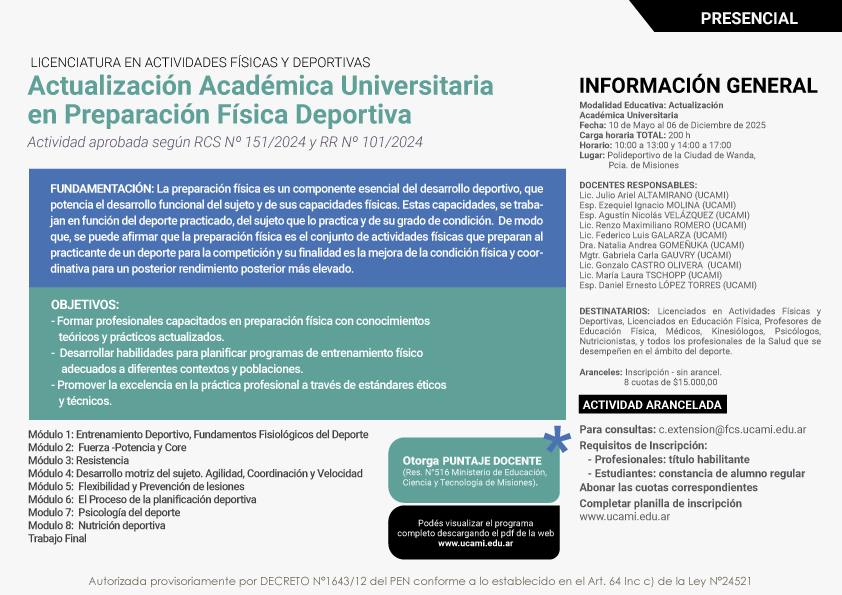 La actividad presencial está destinada a Lic. en Actividades Físicas y Deportivas, Lic. en Educación Física, Prof. de Educación Física, Médicos, Kinesiólogos, Psicólogos, Nutricionistas y todos los profesionales de la Salud que se desempeñan en el ámbito del Deporte.