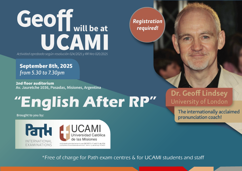 En el marco del Convenio de Colaboración y Cooperación Institucional con Path International Examinations, la Universidad Católica de las Misiones (UCAMI) será sede de la Conferencia “English After RP”, a cargo del Dr. Geoff Lindsey, experto en fonética.