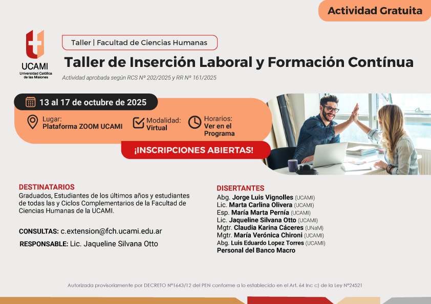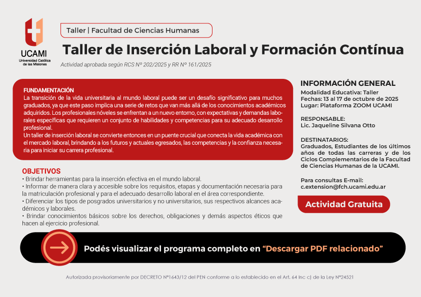 En "Descargar PDF" se puede visualizar el Programa completo del Taller destinado a egresados y estudiantes de los últimos años de todas las carreras de la Facultad de Ciencias Humanas.