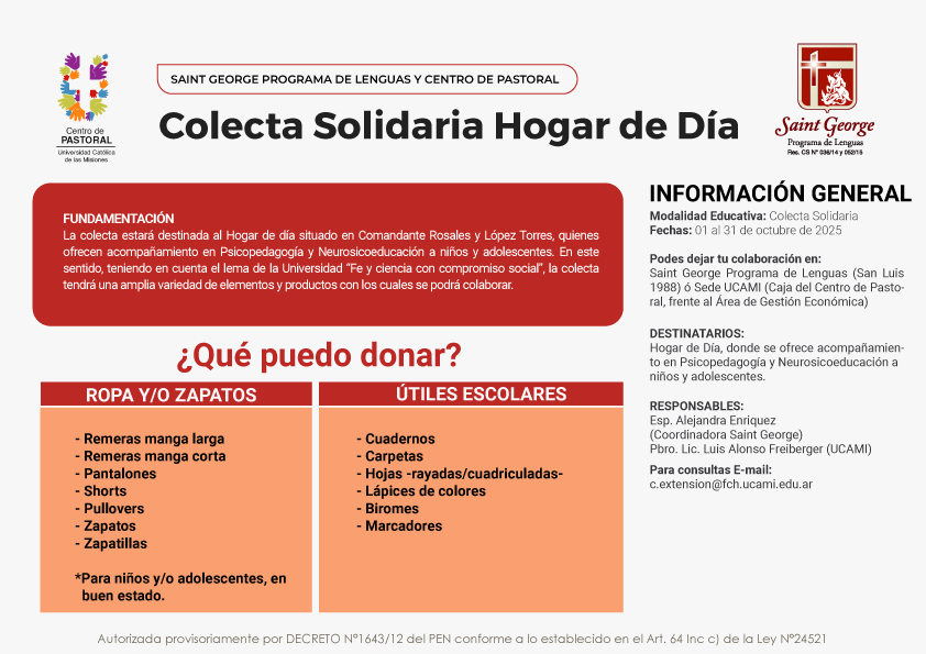 Esta propuesta impulsada por el Saint George Programa de Lenguas y el Centro de Pastoral de la UCAMI, se llevará a cabo desde el 01 al 31 de octubre de 2025, destinada a acompañar a niños y adolescentes que reciben apoyo en psicopedagogía y neurosicoeducación en la ciudad de Posadas.