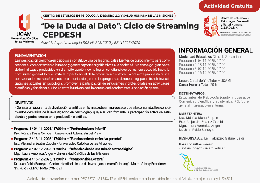 La propuesta busca acercar a la comunidad los conocimientos y avances derivados de la investigación científica en psicología, mediante un formato de divulgación ágil y accesible. A través de cuatro encuentros virtuales, se abordarán temáticas actuales del campo, con el propósito de fortalecer el vínculo entre la universidad, la comunidad académica y la sociedad.