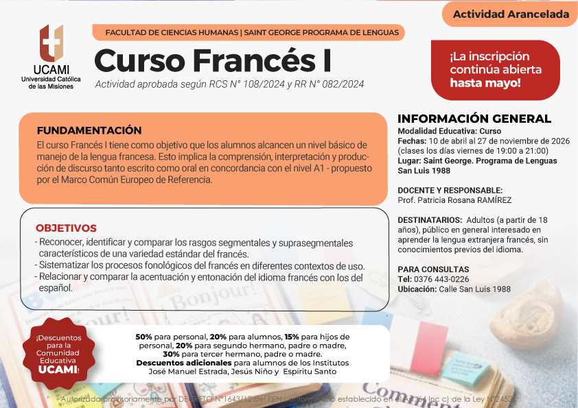 La Facultad de Ciencias Humanas de la Universidad Católica de las Misiones (UCAMI) invita a participar del Curso de Francés I, una propuesta formativa destinada a quienes desean iniciarse en el aprendizaje de la lengua francesa y acercarse a su cultura.