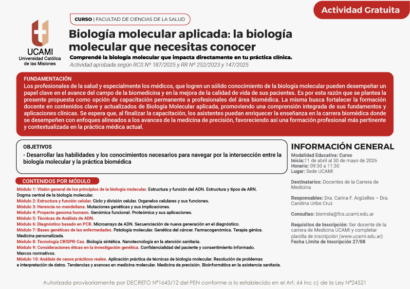 La Facultad de Ciencias de la Salud de la UCAMI desarrollará el curso “Biología molecular aplicada: la biología molecular que necesitas conocer”, una propuesta de capacitación destinada a docentes de la carrera de Medicina.