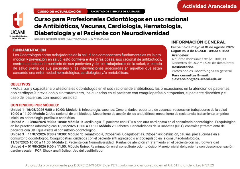 En el marco de la propuesta de Formación Continua, la Facultad de Ciencias de la Salud de la UCAMI desarrollará el Curso de Actualización para Profesionales Odontólogos en uso racional de Antibióticos, Vacunas, Cardiología, Hematología, Diabetología y Paciente con Neurodiversidad, una capacitación orientada a fortalecer el abordaje integral en la práctica odontológica.