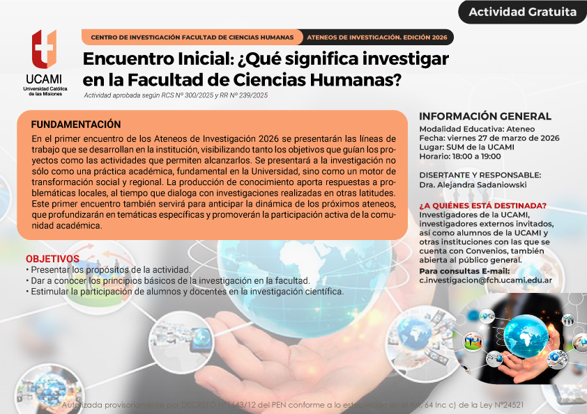 En el marco del fortalecimiento de la investigación académica y la divulgación científica, la Facultad de Ciencias Humanas (FCH) de la UCAMI llevará adelante la edición 2026 de los Ateneos de Investigación, una propuesta coordinada por el Centro de Investigación de la FCH destinada a promover el intercambio académico, la reflexión interdisciplinaria y la difusión de las producciones científicas desarrolladas en la UCAMI y en instituciones con las que la Universidad mantiene convenios.