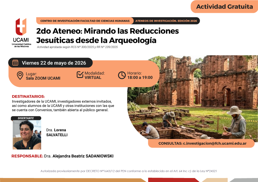 La Universidad Católica de las Misiones, a través del Centro de Investigación de la Facultad de Ciencias Humanas (FCH), llevará adelante el 2° Ateneo de Investigación: “Mirando las Reducciones Jesuíticas desde la Arqueología”, en el marco de los Ateneos de Investigación – Edición 2026.