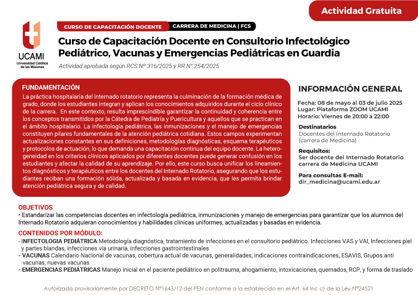 Estandarizar las competencias docentes en infectología pediátrica, inmunizaciones y manejo de emergencias para garantizar que los alumnos del Internado Rotatorio adquieran conocimientos y habilidades clínicas uniformes, actualizadas y basadas en evidencia.