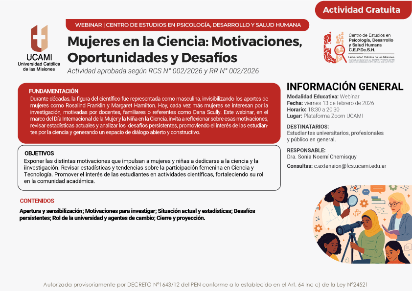 En el marco del Día Internacional de la Mujer y la Niña en la Ciencia, la Universidad Católica de las Misiones invita a participar del webinar “Mujeres en la Ciencia: Motivaciones, Oportunidades y Desafíos”, una propuesta orientada a reflexionar sobre el rol de las mujeres en la producción científica y tecnológica.