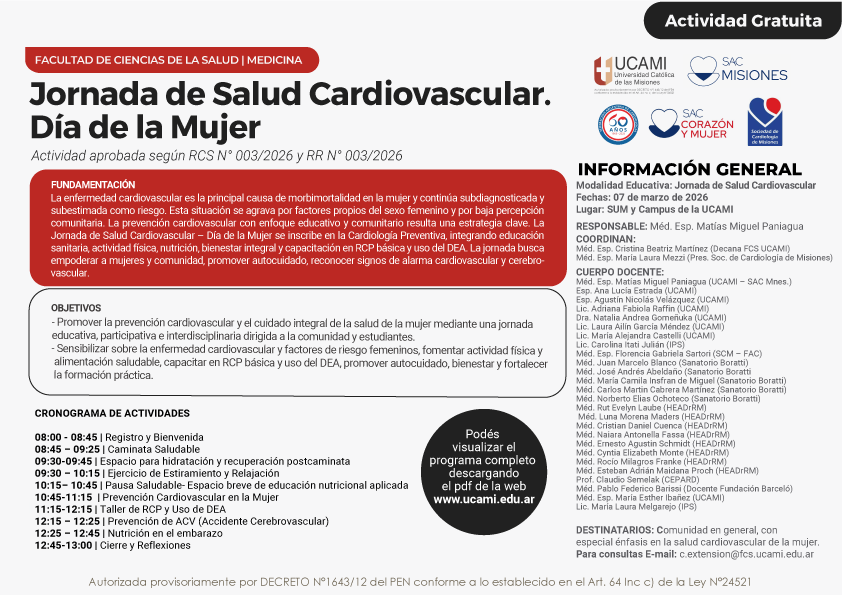 La Facultad de Ciencias de la Salud invita a participar de la Jornada de Salud Cardiovascular, una propuesta orientada a promover la prevención y el cuidado integral de la salud cardiovascular femenina.