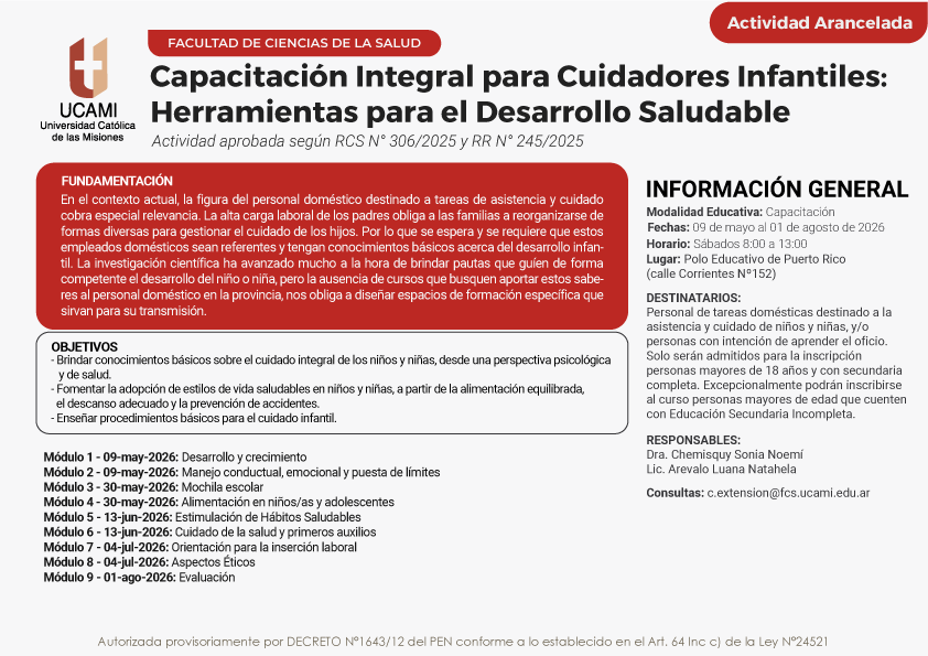 La Facultad de Ciencias de la Salud de la UCAMI llevará adelante la Capacitación Integral para Cuidadores Infantiles: Herramientas para el Desarrollo Saludable, una propuesta que se desarrollará del 09 de mayo al 01 de agosto de 2026, en el Polo Educativo de Puerto Rico, en modalidad presencial.