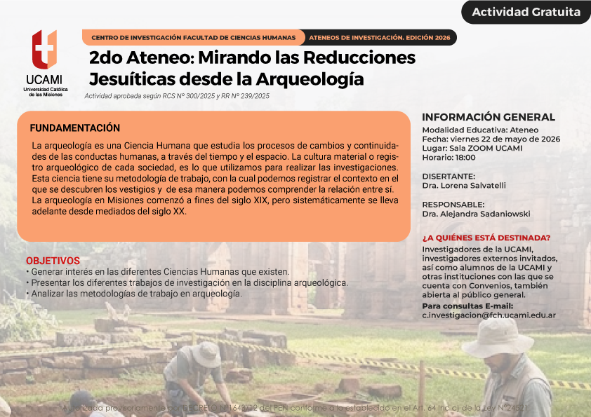 La Universidad Católica de las Misiones, a través del Centro de Investigación de la Facultad de Ciencias Humanas (FCH), llevará adelante el 2° Ateneo de Investigación: “Mirando las Reducciones Jesuíticas desde la Arqueología”, en el marco de los Ateneos de Investigación – Edición 2026.